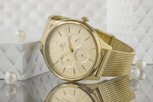 Styl i design: Złoty kolor zegarka mieni się niczym promienie porannego słońca, dodając nadgarstkowi subtelnego luksusu, Elegancka bransoleta mesh oplata nadgarstek lekko i wygodnie, podkreślając kobiecy wdzięk, Tarcza w jednolitym złotym odcieniu z delikatnymi indeksami i subtelnymi sub-tarczami tworzy harmonijną, zmysłową kompozycję.