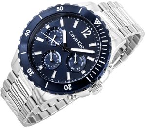 Calvin Klein Sport For Him 25200115 to nowoczesny zegarek o sportowo–eleganckim charakterze, stworzony dla mężczyzn, którzy cenią funkcjonalność, siłę i ponadczasowy styl. Głęboki granat tarczy w połączeniu z chłodnym blaskiem stali tworzy wyrazisty kontrast, który przyciąga uwagę i dodaje klasy każdej stylizacji. Trzy subtarcze – z czasem 24-godzinnym, dniem tygodnia i datownikiem – podkreślają praktyczny wymiar zegarka, zachowując przy tym pełną harmonię i czytelność.