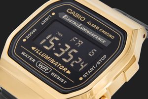 Casio A168WEGB-1BEF to cyfrowy klasyk z lat 80., który łączy retro styl z nowoczesnymi funkcjami. Czarna tarcza, złote detale i czarna, jonowo powlekana bransoleta tworzą elegancki, wyrazisty wygląd. Model został wyróżniony prestiżową Good Design Long Life Design Award i jest idealny dla osób ceniących styl, funkcjonalność i wygodę.