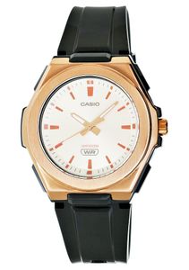 Casio LWA-300HRG-5EVEF to stylowy zegarek, który łączy precyzję kwarcowego mechanizmu z eleganckim designem. Srebrna tarcza z różowo-złotymi indeksami i wskazówkami w połączeniu z czarnym, połyskującym paskiem silikonowym tworzą nowoczesny, uniwersalny wygląd, idealny na co dzień.